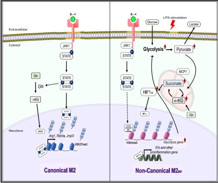 2023年5月,我院郑世进教授团队在Cell Reports发表研究论文The glycolysis/HIF-1a axis defines the inflammatory role of IL-4-primed macrophages。该研究发现,IL-4除了能诱导巨噬细胞分化为M2型巨噬细胞外,经IL-4刺激过的巨噬细胞在接受后续刺激时,具有明显增强的促炎特性,称之为M2INF巨噬细胞。这M2INF巨噬细胞具有训练免疫效应,意味着它们在受到初次刺激后,可以通过改变细胞代谢和表观遗传修饰来增强对后续刺激的免疫应答。