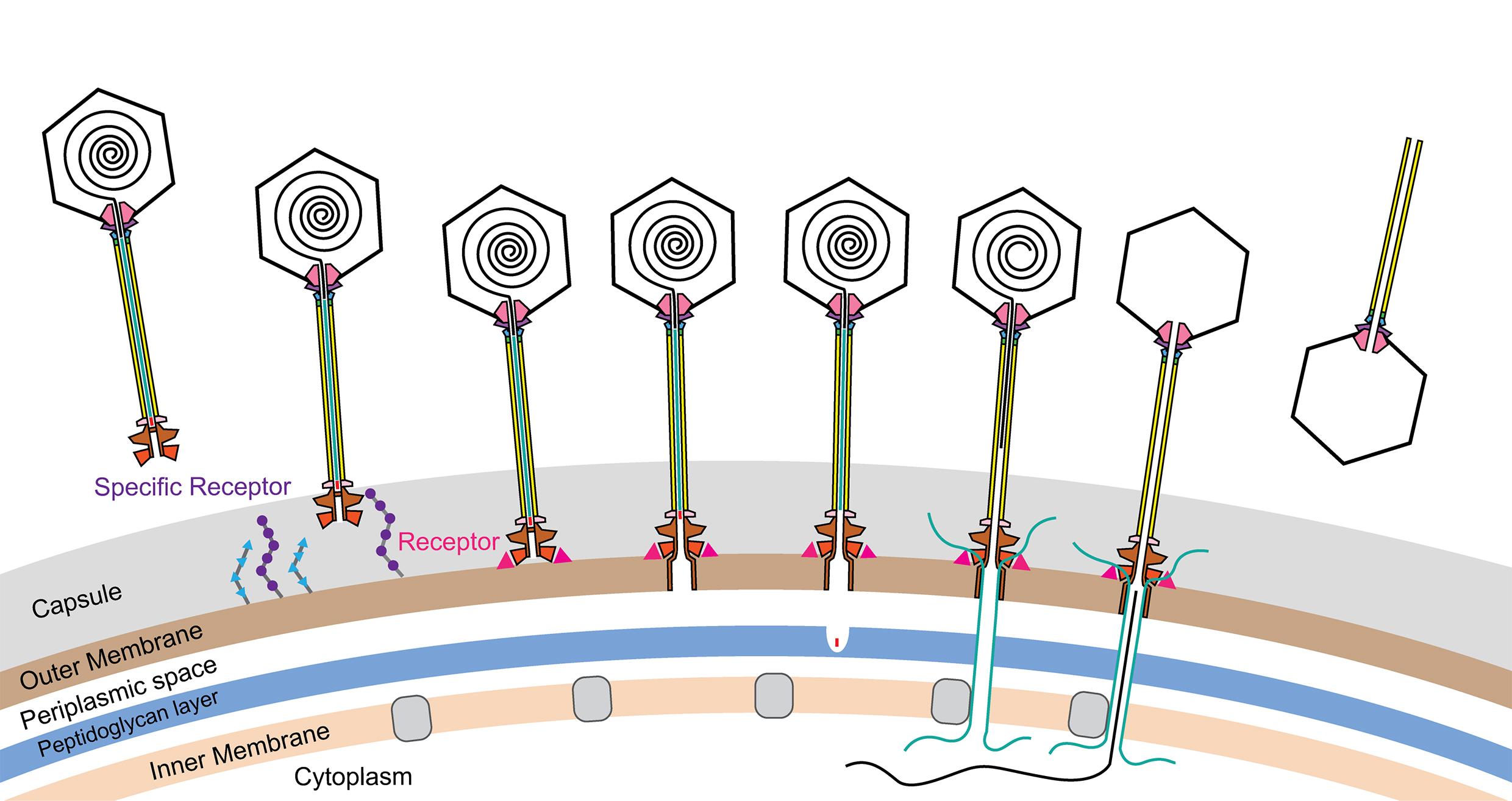 基于完整的R4C病毒粒子的原位结构及蛋白功能分析,研究团队初步提出了R4C噬菌体的DNA递送机制。R4C噬菌体首先通过多种特殊的受体结合域识别宿主,并利用尾部末端的三聚体纤维蛋白将病毒锚定至细菌外膜。随后,处于封闭状态的尾管通道被打开,Megatron蛋白的疏水N端螺旋暴露并插入细菌外膜形成跨膜孔,而尾部卷尺蛋白(TMP)则进入周质空间,穿过细菌的包膜形成跨越内膜的通道。TMP的释放进一步触发一系列结构(例如,门户蛋白隧道环)变化,最终启动基因组的易位。基因组被推入尾管通道,在尾管内表面的负电荷螺旋轨道及直管状结构的辅助下,穿过由TMP形成的通道被注射到宿主细菌中。总体而言,基于结构的研究使研究团队合理地推断每个结构蛋白组分的功能,并进一步表征这种在生态上具有重要作用的长尾噬菌体的DNA传递机制。