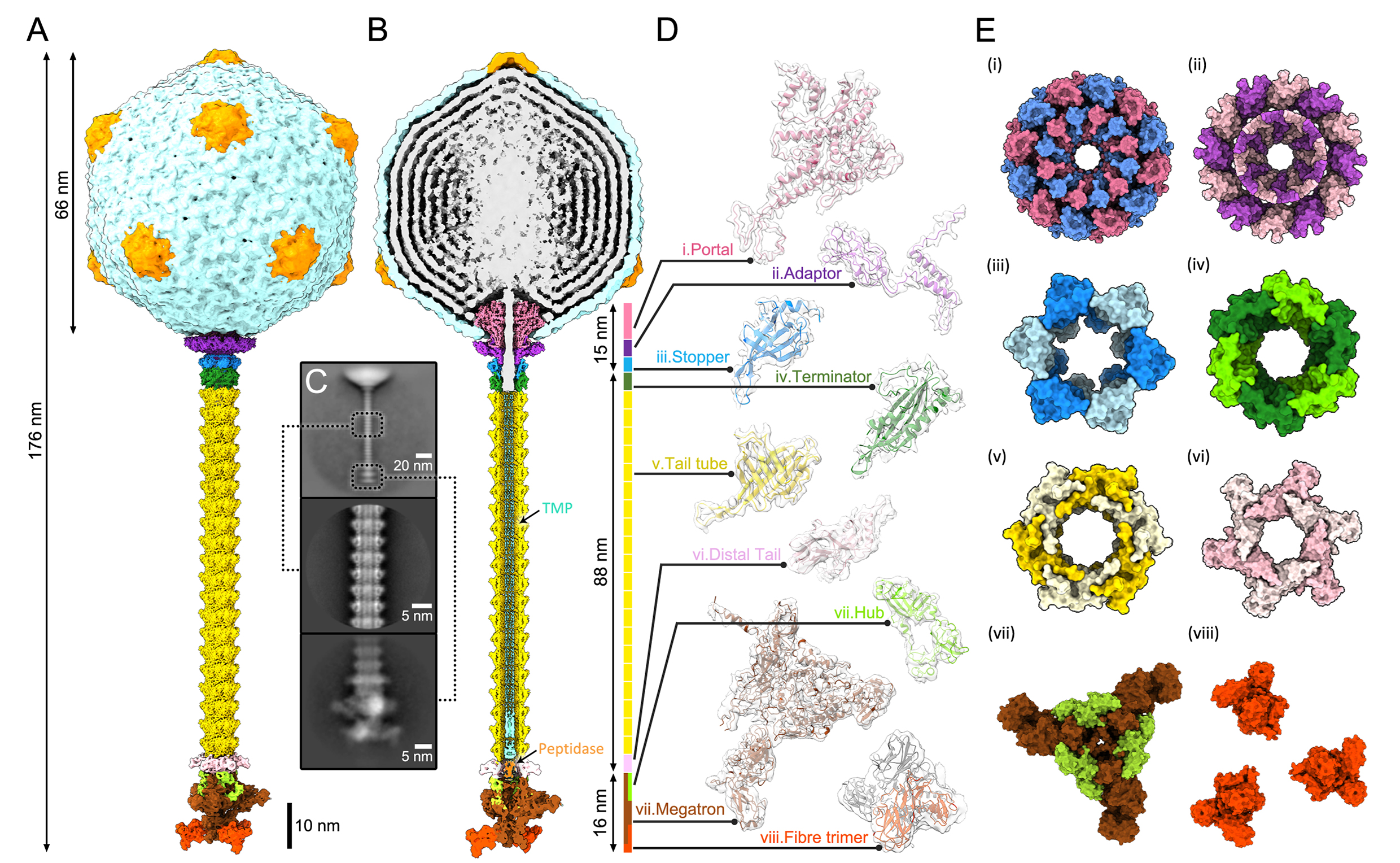 作为生物圈中最为丰富的生物形式,噬菌体在塑造微生物多样性、介导基因交换和调控地球化学元素循环方面发挥着重要作用。长尾噬菌体(Siphoviridae)具有长而非收缩的尾巴,其通过一个头-尾连接模块与病毒的二十面体衣壳相连。Siphoviridae的尾巴装配过程和DNA递送机制涉及多种结构蛋白组分的复杂相互作用。由于噬菌体尾部的结构和遗传多样性,与噬菌体组装、感染和DNA传递相关的精确过程对于大多数噬菌体而言仍然是未知的。玫瑰杆菌是一类革兰氏阴性菌,通常占海洋细菌丰度的15-20%,在藻华期间可能更高,广泛分布于沿海、开阔大洋的表层、深层及沉积物中,在海洋氮、硫、碳和磷元素的生物地球化学循环中有重要作用,并对全球气候产生影响。感染玫瑰杆菌菌群的长尾玫瑰杆菌噬菌体(roseophage)同样在海洋中广泛存在,并被认为是影响玫瑰杆菌的生物学和生态学的主要生物因素。然而,目前对玫瑰杆菌噬菌体的结构知之甚少。