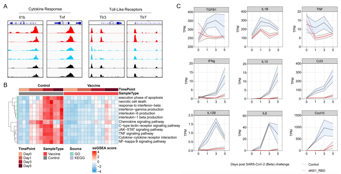 图2.训练免疫在广谱保护中发挥重要作用:A.抗病毒固有免疫基因染色质开放性增加;B.预防组织过度炎症反应;C.维持肺部免疫稳态