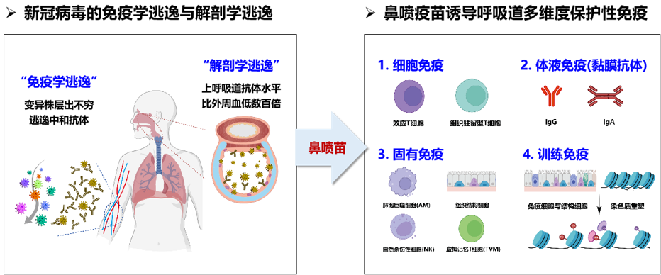 图1.鼻喷苗诱导呼吸道局部多维度保护性免疫应对新冠病毒的“免疫学逃逸”与“解剖学逃逸”
