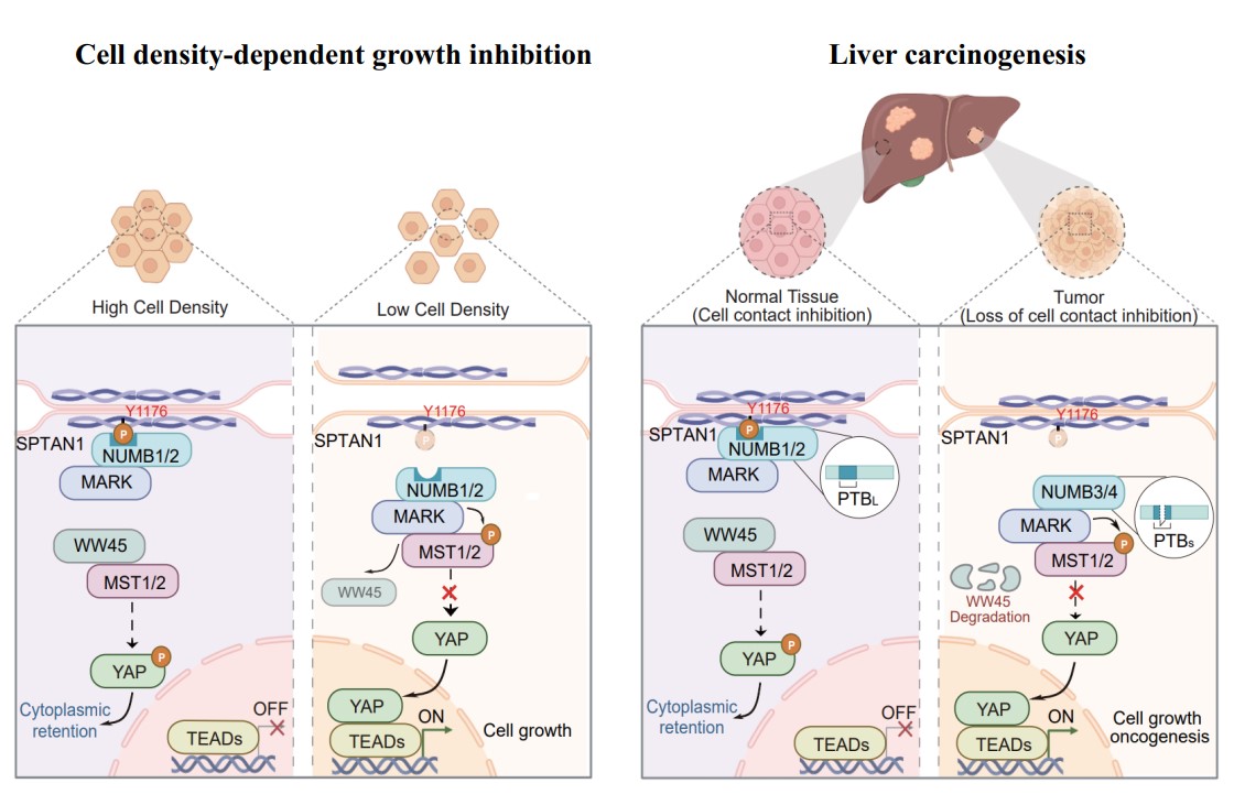 首先,研究人员分别分离了低密度或高密度培养条件下的细胞质膜/细胞骨架和细胞质组分进行定量质谱(DIA-MS)分析,并结合MST2相互作用蛋白质谱筛选到潜在的能够感应细胞密度并调控Hippo通路活性的蛋白。对这些蛋白逐一分析发现NUMB蛋白能够改变它的亚细胞定位来调节Hippo-YAP通路,以响应细胞密度信号来抑制生长。低细胞密度时NUMB定位于细胞质,高细胞密度时NUMB转移到细胞膜同时激活Hippo通路使YAP出核,抑制细胞生长。进一步研究发现,在高密度的细胞中,激活的SRC激酶促进细胞皮层骨架蛋白SPTAN1 (spectrin alpha chain, non-erythrocytic 1) 1176位酪氨酸的磷酸化,磷酸化的SPTAN1结合NUMB的PTB结构域从而将NUMB招募到细胞膜上,NUMB进一步招募MARK激酶,解除了它对MST1/2的抑制作用。