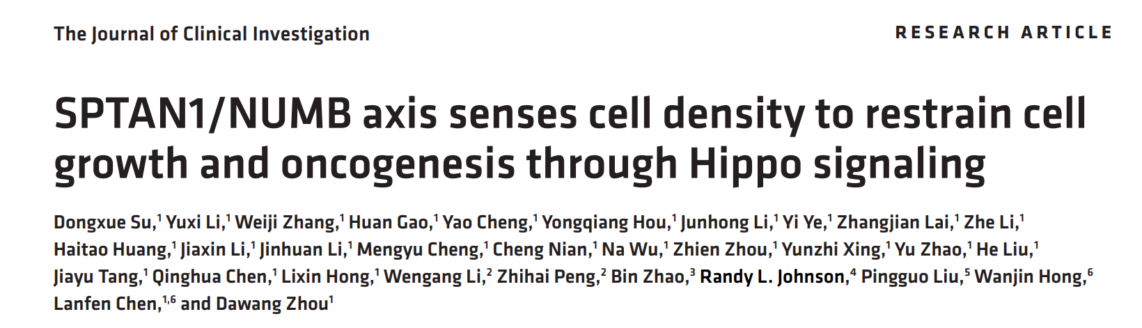 2023年10月16日,周大旺/陈兰芬团队在The Journal of Clinical Investigation杂志上发表了题为The SPTAN1/NUMB axis senses cell density to restrain cell growth and oncogenesis through Hippo signaling的研究论文。这项研究证明了SPTAN1-NUMB作为细胞密度传感器,通过将外部细胞-细胞接触信号整合到细胞内的Hippo-YAP信号来抑制细胞生长和肿瘤发生。同时还揭示了NUMB异构体剪接在细胞接触抑制丧失和癌症发生中的重要作用。