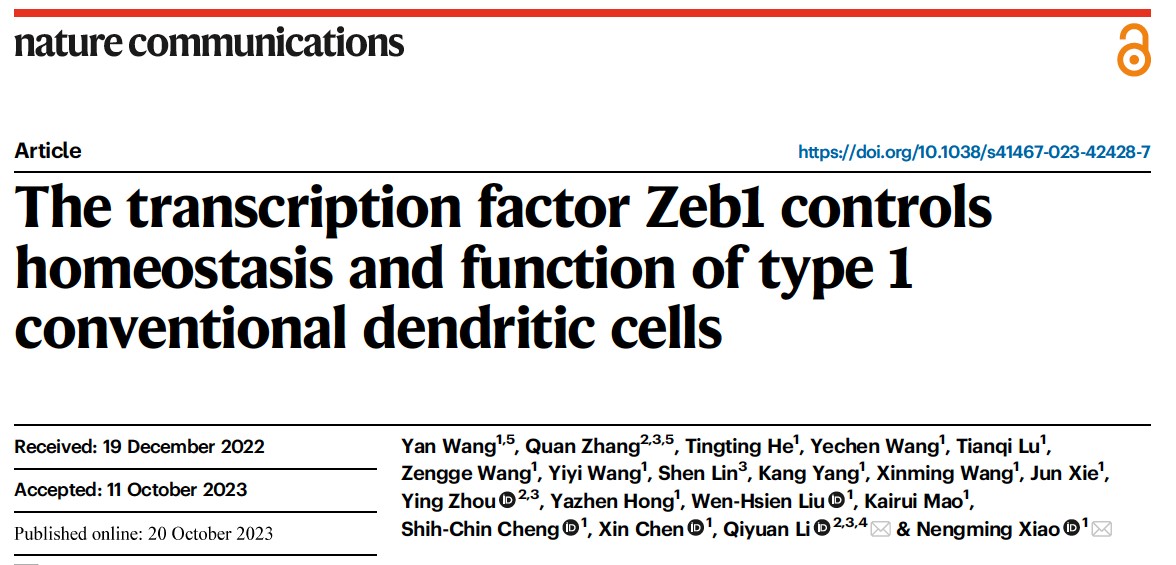 2023年10月20日,肖能明教授课题组在Nature Communications杂志上发表了题为“The transcription factor Zeb1 controls homeostasis and function of type 1 conventional dendritic cells”的研究论文,揭示了Zeb1-microRNA-96/182-cybb通路在cDC1抗原交叉递呈中的重要调控作用以及Zeb1在脾脏cDC1稳态维持中的必要性。