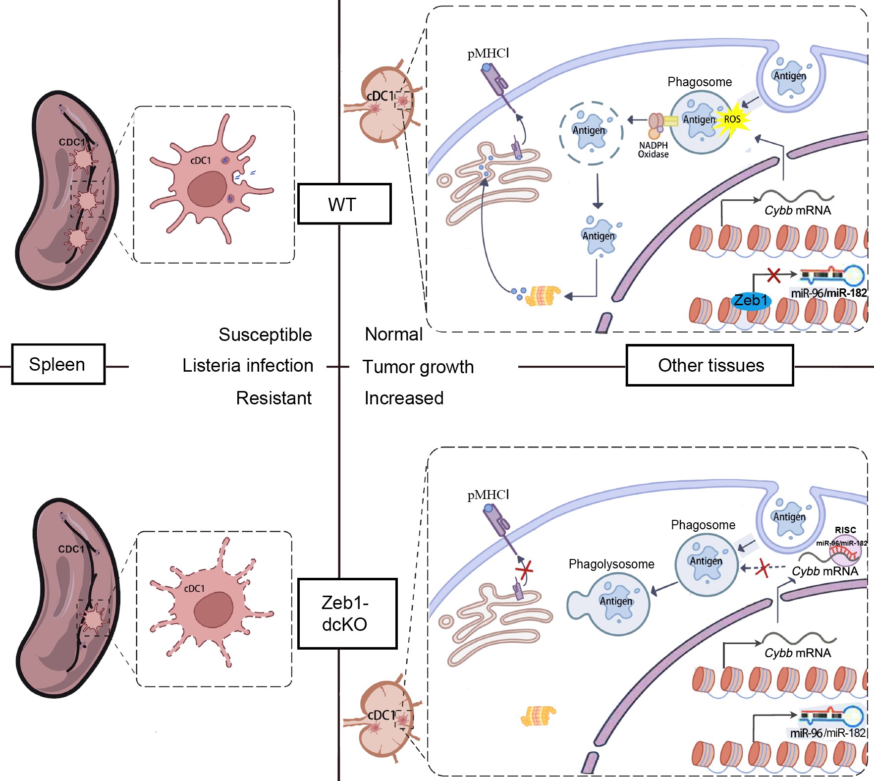 研究人员发现,Zeb1在I型经典树突状细胞稳态和功能中的调控作用,可归纳为两部分:一是在维持I型经典树突状细胞稳态方面,树突状细胞特异性缺失Zeb1的条件性敲除小鼠的脾脏中因cDC1过度死亡而发生特异性的细胞减少,脾脏cDC1是单核增生李斯特杆菌感染机体的首要细胞,减少cDC1则会增强机体抵抗李斯特杆菌的感染。二是在cDC1对细胞外抗原的交叉递呈能力方面,在野生型(WT) cDC1中,Zeb1会抑制miR-96/miR-182的转录,间接进而促进Cybb的表达,Cybb蛋白表达后被招募至吞噬体内组成NADPH氧化酶Nox2,催化吞噬体活性氧(ROS)的产生,导致吞噬体膜破损将吞噬体内摄取的外源抗原释放至细胞质中,经过蛋白酶体降解后产生多肽,再装载至MHC-Ⅰ复合体上,由MHC-Ⅰ呈递至cDC1细胞表面,完成抗原交叉递呈功能;而在Zeb1缺失的cDC1中,miR-96/miR-182的过度转录会抑制Cybb的表达,没有办法产生足够的吞噬体ROS,造成吞噬体膜无法破损,无法释放抗原至细胞质中进行蛋白酶体降解,而将大部分抗原转运至溶酶体内,并在溶酶体内进行无差别降解,损失抗原肽信息,从而无法有效地完成抗原递呈功能。