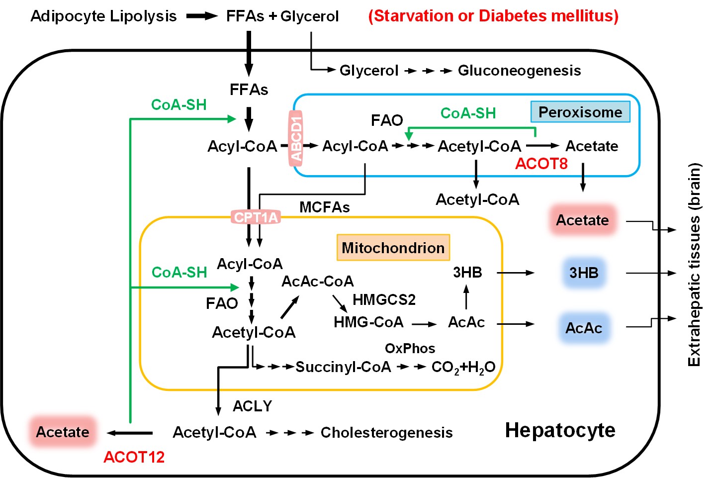 为了探究糖尿病引起的代谢改变,李勤喜教授和化学化工学院林东海教授团队首先通过NMR技术检测了临床糖尿病患者血液样品中的代谢物,发现糖尿病患者血液中的乙酸浓度显著高于健康者,然而其分子机制和生理意义尚不清楚。为了进一步揭示乙酸升高的机理及意义,作者通过糖尿病小鼠模型、GEO数据库差异分析、小鼠肝脏基因特异性敲低、代谢物同位素示踪等技术开展了一系列研究,发现:(1)在糖尿病或饥饿情况下,肝脏中ACOT12和ACOT8蛋白表达显著上调,能够水解脂肪酸来源的乙酰辅酶A生成乙酸;(2)乙酸类似于酮体,可供肝外组织作为能源物质使用,缓解机体的能量危机;(3)该生化反应同时还产生还原型的CoA,而游离的CoA-SH是脂肪酸氧化所必须的辅酶,因此,该反应有助于维持脂肪酸在能量应激时的持续氧化。