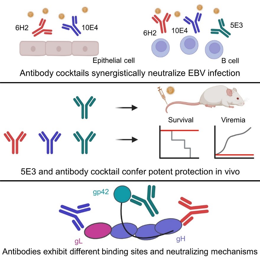 EB病毒(Epstein-Barr virus,EBV)是一种常见的人类疱疹病毒,也是首个被证明可诱发癌症的人致瘤病毒。其与人传染性单核细胞增多症、多种淋巴瘤及上皮细胞肿瘤的发生发展密切相关,尤其是我国两广地区高发的鼻咽癌。全球每年发现EBV感染相关的肿瘤病例超20万,死亡病例超14万。此外,EBV感染还可引起多发性硬化症、系统性红斑狼疮和类风湿关节炎等自身免疫性疾病。最新报道还提示EBV再激活与长新冠相关。EBV在成年人群中的感染率高达95%,一旦感染可终生潜伏。其主要通过其表面多种包膜糖蛋白的不同搭配组合实现对人上皮细胞或淋巴B细胞的感染。糖蛋白gp42是EBV感染淋巴B细胞的关键分子,而糖蛋白gHgL在EBV感染上述两类细胞的过程中都发挥着关键作用。因此,发现靶向gp42和gHgL高效中和抗体并解析其中和机制从而实现对EBV感染的阻断,是研发靶向EBV的抗病毒药物和疫苗的重点方向。