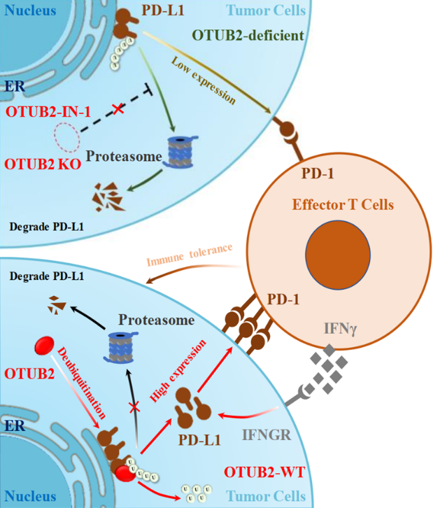 OTUB2调控内质网上PD-L1稳定性的示意图