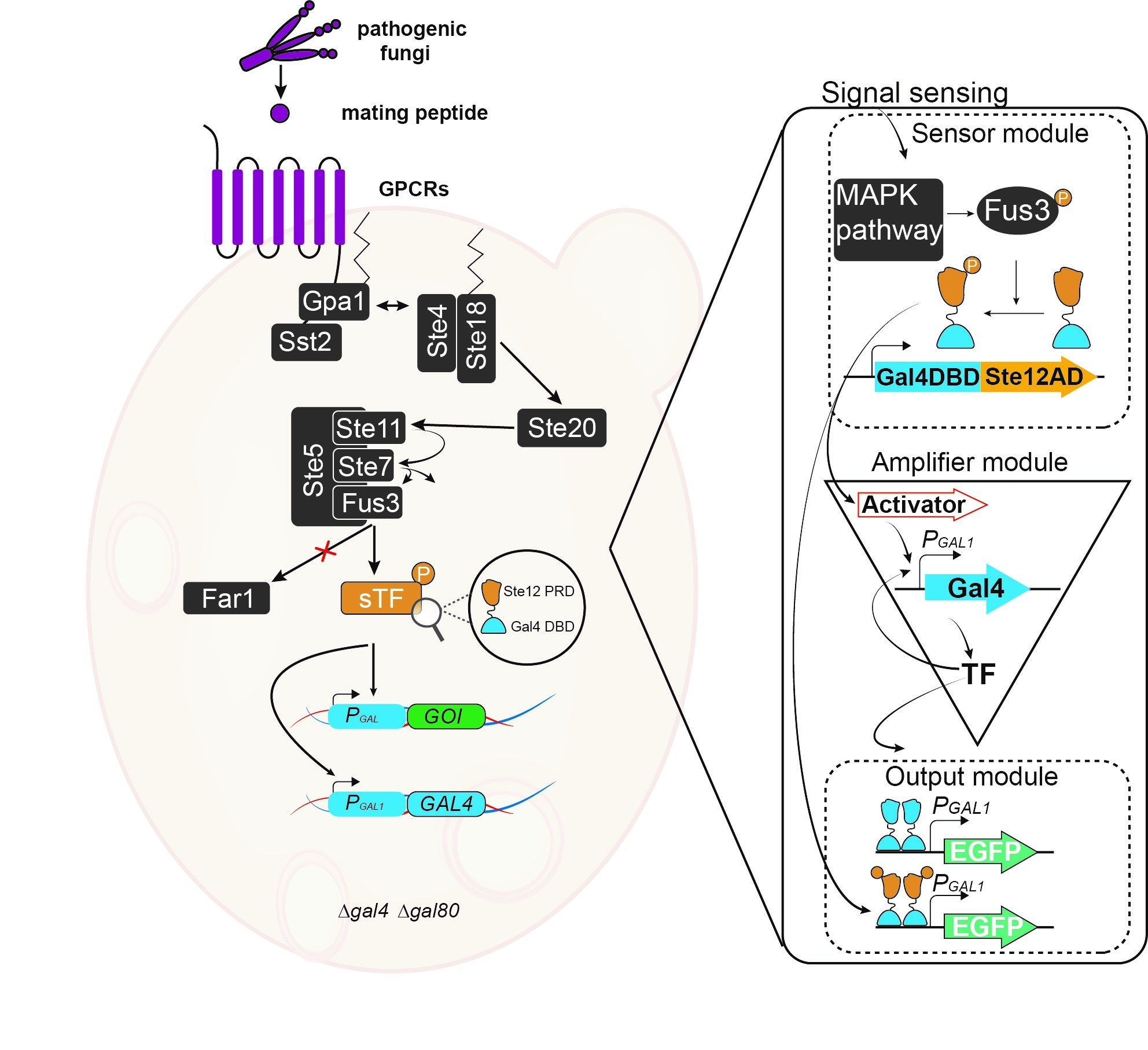 研究人员前期在酿酒酵母中利用GPCR 信号级联来重塑具有不同表达谱的酵母半乳糖调节子,展示了基于GPCR系统的可塑遗传装置可能为未来的代谢工程和生物传感器应用带来巨大的希望。而GPCR系统在细胞信号转导中发挥着至关重要的作用,已被广泛用作酵母的传感元件生物传感器开发。因此研究人员在前期研究基础上通过人工转录因子(synthetic transcription factor,sTF)将GPCR信号通路与半乳糖调节(GAL)系统连接起来(Cell Reports Methods, 2023, 3, 100647),引入了正反馈回路进一步增强酵母传感器的性能,从而开发模块化酵母生物传感器,可低成本、灵敏且快速地检测病原真菌。