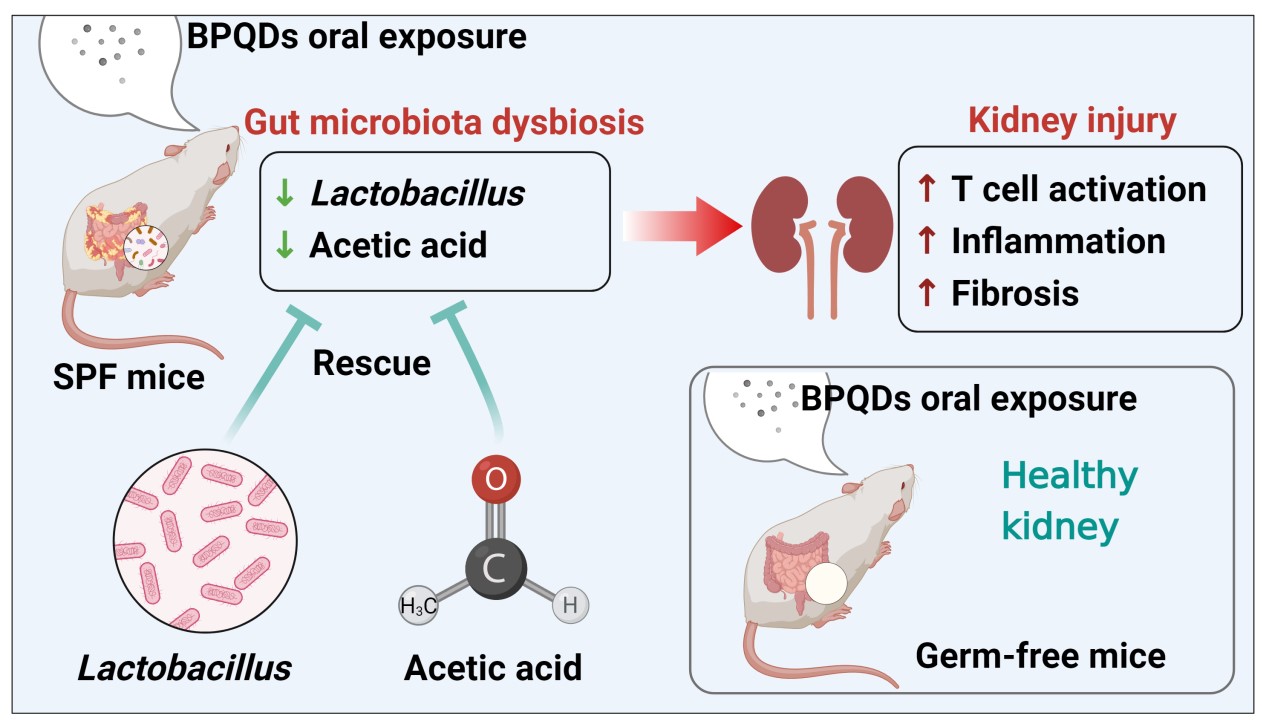 本研究首次报道了BPQDs抑制乳酸杆菌存活及对肠道菌群稳态的影响,揭示纳米颗粒经肠道菌群-代谢物-肾脏轴介导肾损伤机制,证明了罗伊氏乳杆菌、乙酸盐补充修复肠道菌群是保护纳米肾毒性的有效干预方式。