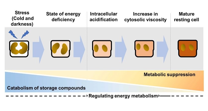 研究提出,寒冷和黑暗环境导致硅藻细胞内能量大量消耗和代谢调整,造成能量不足,进而引发细胞内酸化。这种酸化促使细胞质和叶绿体粘度增加,代谢速率减缓,最终形成休眠细胞。这项研究为硅藻休眠细胞特征和形成机制提供了新认识,有助于深入理解硅藻的生态竞争优势。