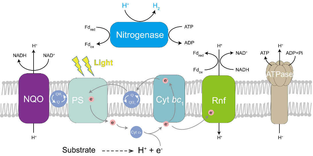 由于底物转化率高、产氢量大、可吸收的太阳能光谱较宽及底物来源广泛等优点,紫色非硫光合细菌(purple non-sulfur photosynthetic bacteria, PNSB)介导的光发酵制氢被认为是最具潜力的生物制氢方法之一(图1)。然而,PNSB胞内ATP和还原力的供给不足限制了固氮酶活性和氢气的合成。因此,迫切需要有效的多维度策略来提高ATP和还原力供给,以提高PNSB产氢性能。