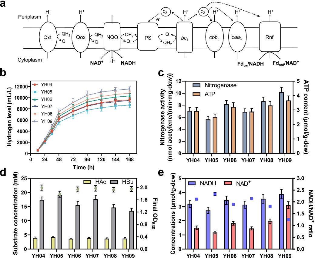 近日,袁吉锋教授、张阳助理教授与西安交通大学郭烈锦院士合作在Chemical Engineering Journal上发表了一篇题为“Multidimensional engineering of Rhodobacter sphaeroides for enhanced photo-fermentative hydrogen production”的研究论文。该论文在球形红细菌中改造捕光复合物、电子传递链、ADP合成路径、F0F1-ATPase表达、以及固氮酶表达,多维度提高ATP和还原力供给,最优菌株在摇瓶分批补料发酵中产氢量为17630.4 mL/L,产氢速率和产氢得率分别为61.2 mL/(Lh)和3.0 mol/mol-acetate,这代表了目前最高产氢性能的菌株之一,为光发酵制氢的应用发展提供有力的支撑。