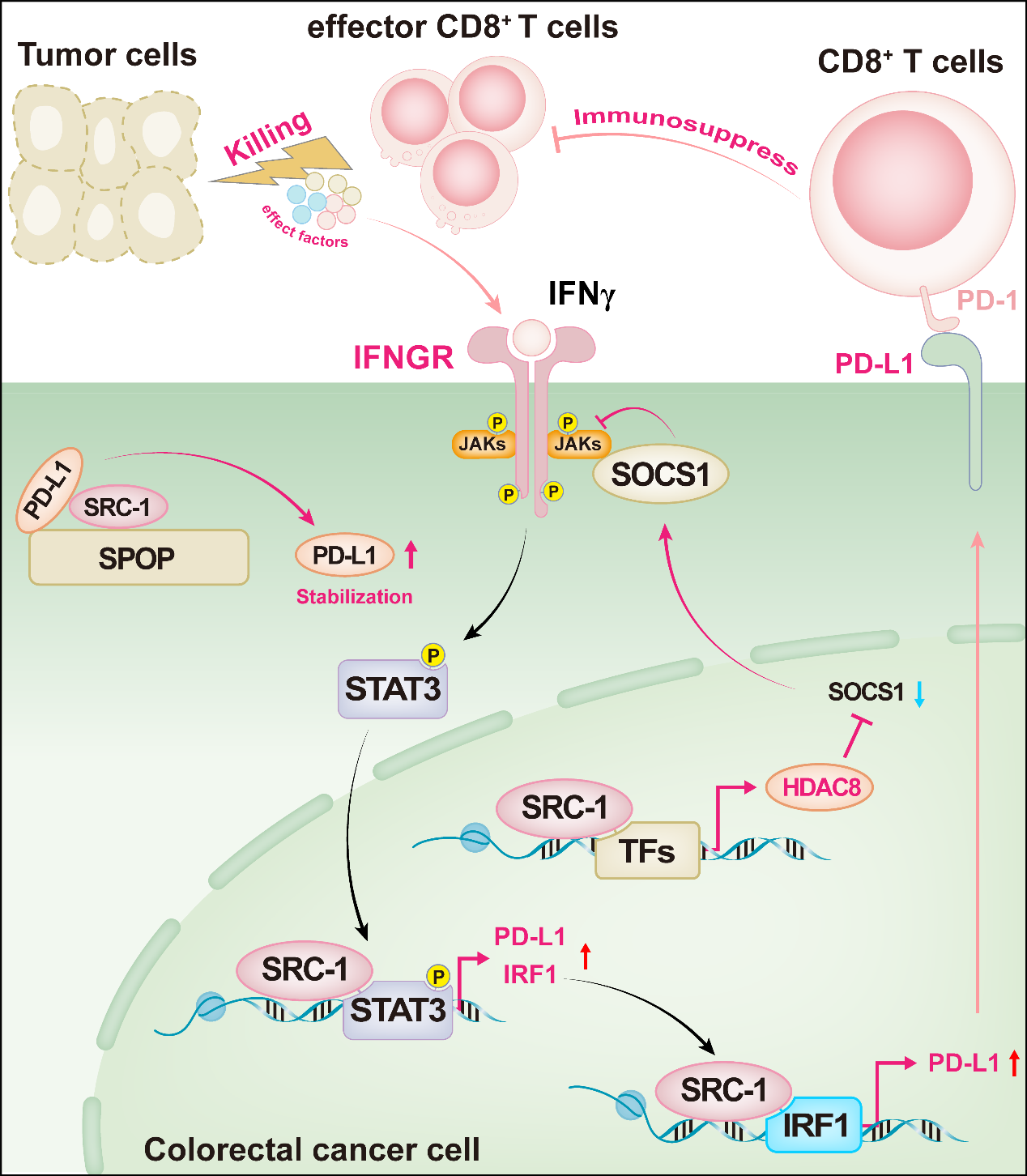 类固醇受体辅激活子1(Steroid receptor coactivator 1, SRC-1)是SRC家族的成员之一,也称为NCOA1,已被报道在多种癌症类型中高表达。SRC-1可以辅激活不同的核受体(Nuclear receptors, NFs)和转录因子(Transcription factors, TFs),促进靶基因的转录激活。先前研究表明,SRC-1可通过提高CRC细胞的增殖、迁移和侵袭能力来促进CRC的进展,但其在CRC免疫逃逸中的作用尚不清楚。俞春东/叶韵斌团队研究发现,在CRC细胞中敲低或敲除SRC-1可下调PD-L1的表达,提示SRC-1可能是PD-L1潜在调控因子。进一步,利用荷瘤小鼠和AOM/DSS诱导的原位癌模型证明了SRC-1通过上调PD-L1表达以抑制CD8+ T细胞的肿瘤浸润和效应功能。在机制上,该研究发现SRC-1通过组蛋白去乙酰化酶8(Histone deacetylase 8, HDAC8)介导的细胞因子信号抑制因子1(Suppressor of cytokine signaling 1, SOCS1)下调来激活JAK1-STAT3-IRF1信号通路,并辅激活STAT3和IRF1以增强PD-L1转录;SRC-1还可通过与PD-L1竞争性结合SPOP,抑制SPOP介导的泛素化来提高PD-L1的稳定性。此外,该研究发现在CRC细胞中敲除SRC-1或利用SRC-1的小分子抑制剂蟾蜍灵(Bufalin)可协同增强PD-L1抗体的抗肿瘤效果。PD-L1抗体单药治疗可以诱导JAK1和STAT3的磷酸化以上调肿瘤PD-L1的表达,这可能是部分CRC患者对PD-L1抗体单一治疗不敏感或耐药的原因之一;而低剂量Bufalin与PD-L1抗体的组合策略对JAK1-STAT3-IRF1信号以及PD-L1表达的抑制表现出协同作用,提示药物抑制SRC-1联合PD-L1抗体的组合策略可能成为解决CRC免疫治疗局限性的有效途径之一。