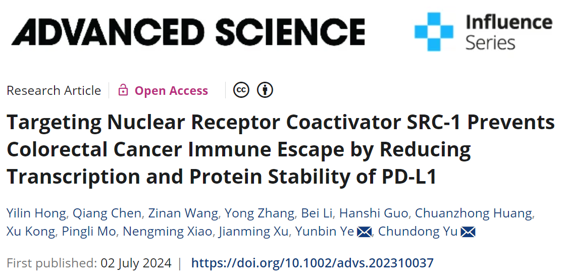 7月2日, 厦门大学生命科学学院俞春东教授和福建省肿瘤医院叶韵斌教授团队合作在Advanced Science杂志在线发表题为Targeting nuclear receptor coactivator SRC-1 prevents colorectal cancer immune escape by reducing transcription and protein stability of PD-L1的研究论文。该研究发现,结直肠肿瘤中的SRC-1可上调PD-L1表达以抑制CD8+ T细胞的肿瘤浸润和效应功能,进而促进结直肠肿瘤免疫逃逸;并提示靶向抑制SRC-1联合PD-L1抗体的组合策略可能成为提高Anti-PD-1/PD-L1疗效的有效途径之一。