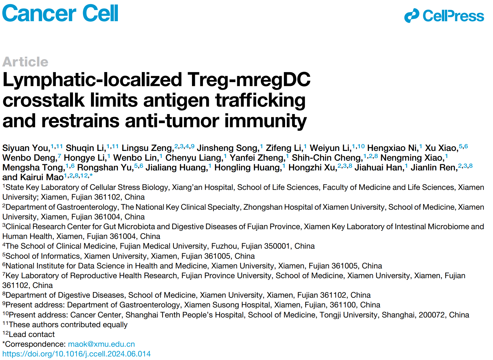 2024年7月18日,细胞应激生物学国家重点实验室、厦门大学生命科学学院/翔安医院毛开睿教授在Cancer Cell期刊在线发表了题为“Lymphatic-localized Treg-mregDC crosstalk limits antigen trafficking and restrains anti-tumor immunity”的研究论文,揭示了肿瘤微环境中Treg独特的空间定位及其抑制抗肿瘤免疫反应的新机制。