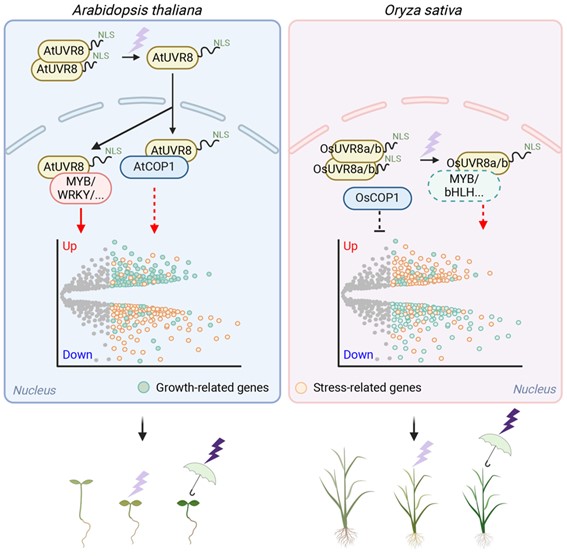 综上所述,该研究通过解析水稻UV-B光受体的作用机制,阐明了水稻感知与适应UV-B光信号的分子基础,提出了单双子叶植物UV-B光信号网络的保守性与特异性(图1)。