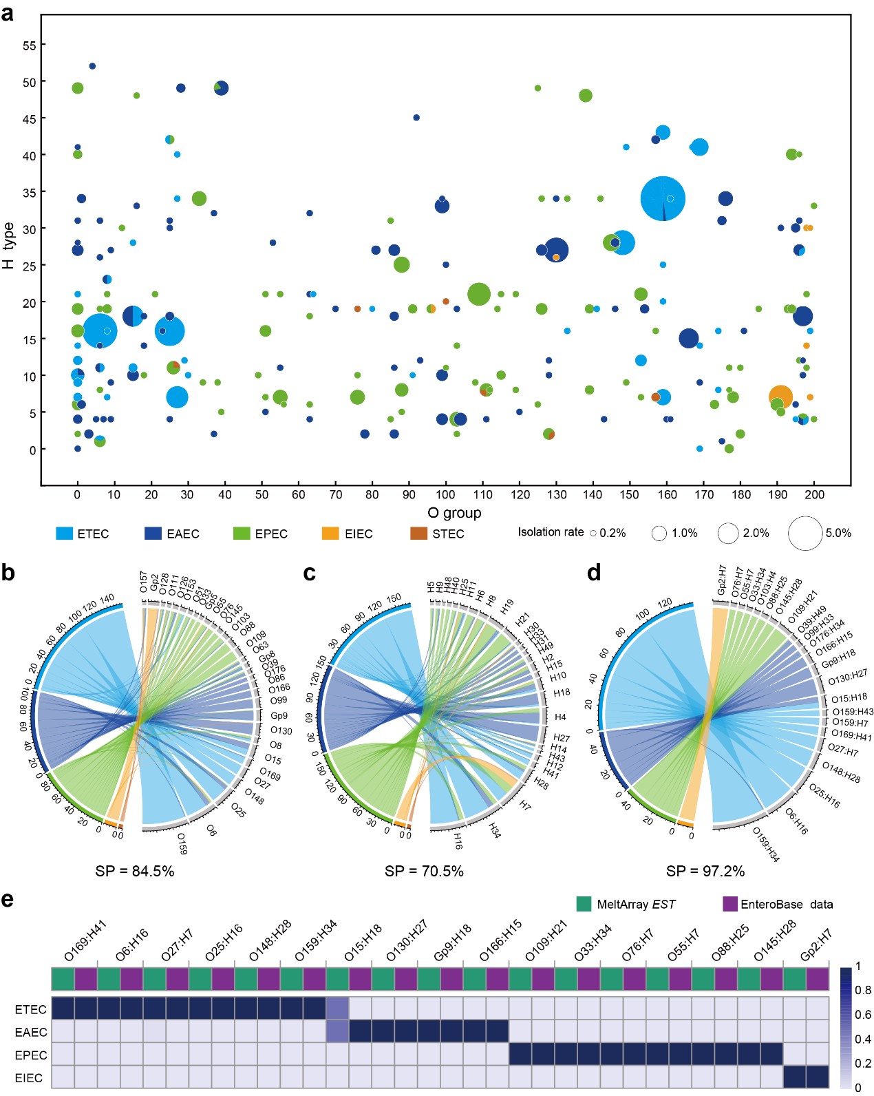 为全面评估MeltArray EST大规模应用效果,研究团队在广东、河南、四川、江苏和浙江开展了一项多中心研究。试验共收集了637份来自腹泻患者的大肠杆菌菌株,在544株致泻性大肠杆菌中,鉴定出218种不同的O:H血清型,每种占总数的不到5%,表现出丰富的血清型多样性(图4)。为了分析血清型与致病型之间的关系,研究人员引入了“血清型纯度SP值”的概念,即每个血清型中属于主导致病型的菌株百分比。研究结果显示,O血清型、H血清型和O:H血清型的SP值分别为84.5%、70.5%和97.2%(图5),表明血清型与其对应的致病型型之间存在一一对应关系。为进一步确认MeltArray EST的分析结果,研究团队从EnteroBase数据库下载全球范围内的全基因组序列进行致病型与血清型预测,分析结果与MeltArray EST一致,证明了本研究发现的血清型与致病型之间关联的普适性。此外值得重视的是,研究团队在来自广东省和河南省的菌株中监测到4株EAEC O104:H4,该血清型是2011年导致欧洲一起导致严重疾病溶血性尿毒综合征(HUS)疾病暴发的元凶,造成4000多人感染,其中50人死亡。尽管这4株菌株相比于欧洲菌株缺少编码志贺毒素的stx2基因,但是已有报道EAEC O104:H4可通过基因水平转移获得stx2基因,提示在全国加强该血清型监测的必要性。
