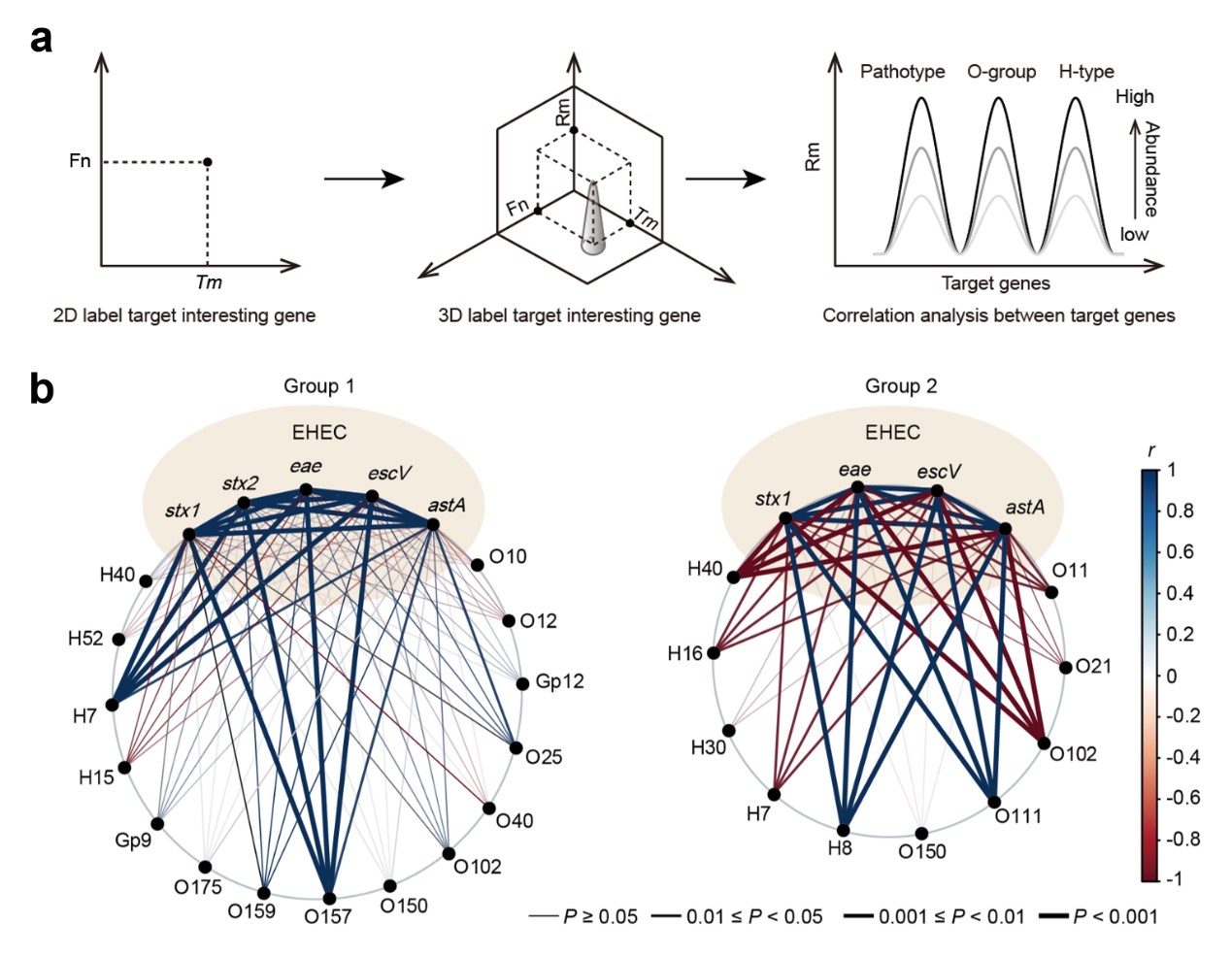 大肠杆菌血清型被认为是识别食源性疾病暴发的标志物,但是基于培养的方法获得分离株的O:H血清型需要近一周的时间,不能快速提供暴发疫情调查的病原学证据。如果能找到一种不依赖培养的方法,将极大缩短检测周期,及时应对暴发疫情的调查。研究团队在“荧光-熔点”二维标签策略的基础上创造性提出“荧光-熔点-峰高”三维标签策略 (图2a),并通过在阴性粪便中梯度掺入肠道出血性大肠杆菌EHEC的两组模拟实验,证明三维标签策略可以直接应用于粪便核酸样本的检测,确定致泻性大肠杆菌毒力基因、O血清型特征基因与H血清型特征基因之间的关联 (图2b)。