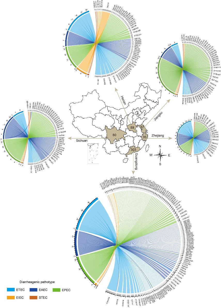 图4 中国五个省份致泻性大肠杆菌致病型与血清型地理分布