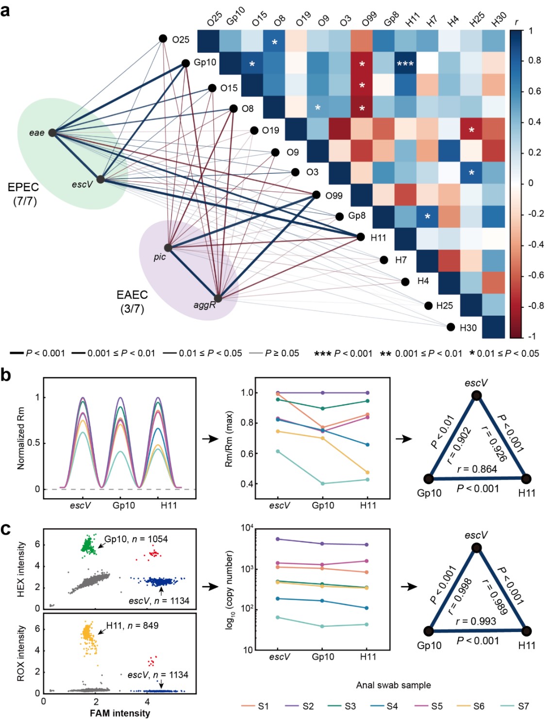 研究团队通过对深圳市一起食物中毒事件的病例肛拭子样本的回顾性研究,发现所有的7份病例样本均能检出肠道致病性大肠杆菌EPEC的特征毒力基因,且熔解峰峰高Rm值与血清型特征基因Gp10及H11呈现强相关关系,确认暴发菌株致病型为EPEC,血清型为Gp10:H11(图3),数字PCR绝对定量及分离株测序证实了上述结论。从而证明MeltArray EST能够在获得肛拭子样本4小时内对粪便样本中致泻性大肠杆菌成功进行血清型鉴定。