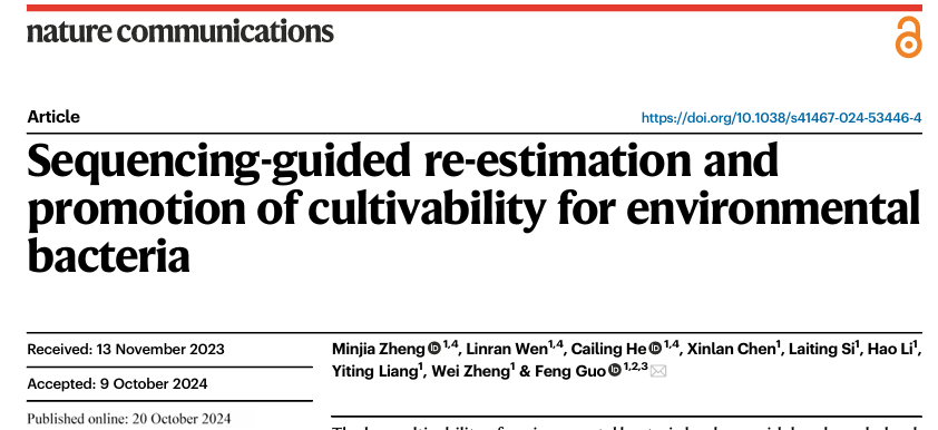 2024年10月20日,郭峰副教授课题组在《Nature Communications》期刊上发表了题为“Sequencing-guided re-estimation and promotion of cultivability for environmental bacteria”的研究论文。该研究重新估算了环境细菌的可培养率,将其与经典的细胞水平可培养率进行比较,表明了过去可培养率的总体低估。同时,该研究提出将可培养属性作为表型,基于测序数据挖掘可培养细菌类群信息和基因组代谢潜力信息,用于指导分离培养特定微生物。