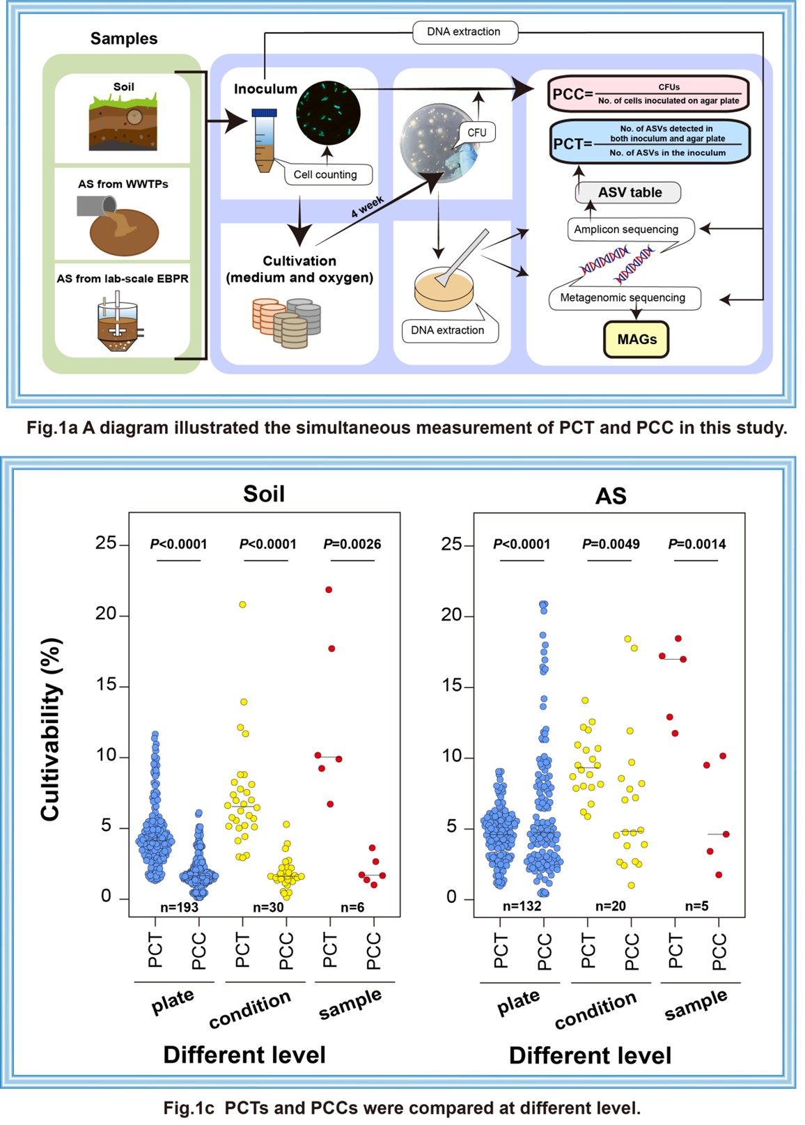 研究针对两类典型环境样本(6个土壤和5个活性污泥样本)中的细菌,采用了简化培养组学方法(不同氧气条件和培养基类型)。基于传统的显微计数和CFU计数测定细胞水平可培养率;通过测序掌握原始样品和平板培养后的细菌类群信息,从而计算分类单元可培养率(图1a)。结果显示,在样品全培养条件,分类单元可培养率远高于细胞水平可培养率(约为2.8-6.0倍)(图1c),这暗示以往测定的细胞水平的可培养率低估了环境细菌的可培养多样性。