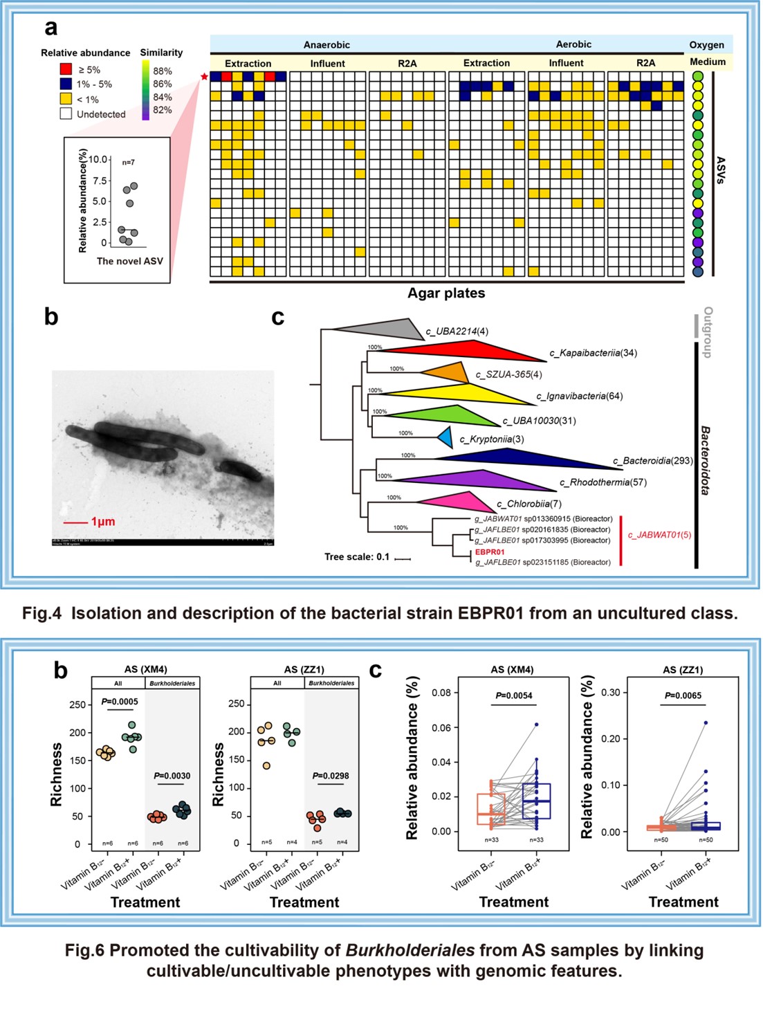 研究还将在特定培养条件下的“可培养/不可培养”属性视为细菌的表型。这一表型信息可以从两个方面指导提升特定微生物的分离培养效率:1)基于可培养细菌的分类学信息,可以指示什么样品和什么培养条件可以培养出特定感兴趣的细菌类群,从而定点挖掘该菌;2)基于在限定范围内(研究中限定为一个细菌目),比较样品内的不可培养细菌和可培养细菌基因组信息,挖掘关键差异基因,可以反向推断在培养条件中需要改进的潜在条件。在本研究中,根据第1条,研究者从一个反应器污泥样本中在特殊培养条件下(原位培养基和厌氧条件),分离获取了一个新纲代表菌株EBPR01(图4);根据第2条,我们发现Burkholderiales目的不可培养类群普遍缺失维生素B12合成基因,在培养基内补充维生素B12可以显著提高该目的可培养多样性(图6b,c)。