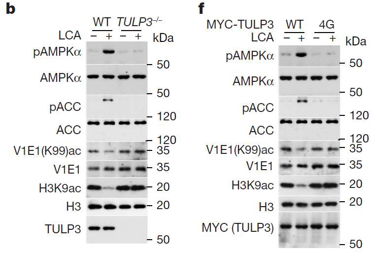 图8. TULP3敲除阻止了石胆酸对AMPK的激活(左),且回补不结合石胆酸的突变体(TULP3-4G)无法恢复石胆酸对AMPK的激活(右)