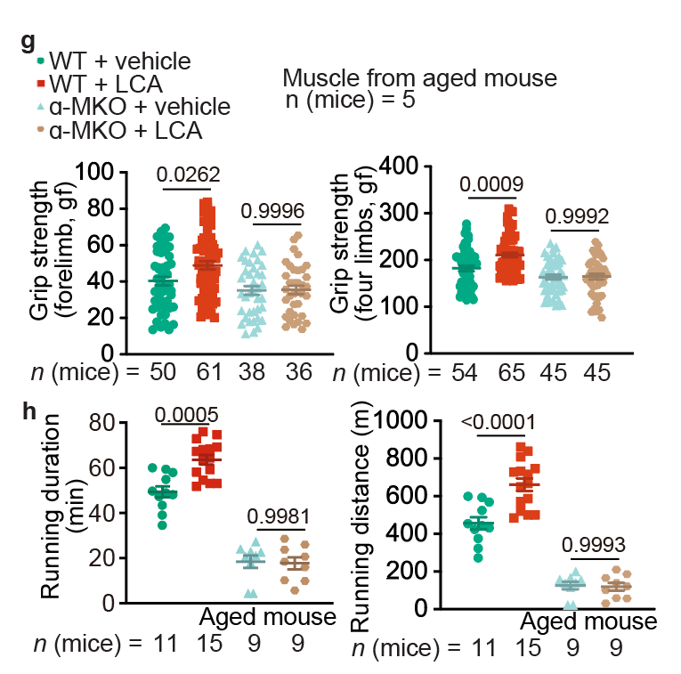 图5. 石胆酸通过AMPK增加老年小鼠的握力(上)和跑步能力(下)