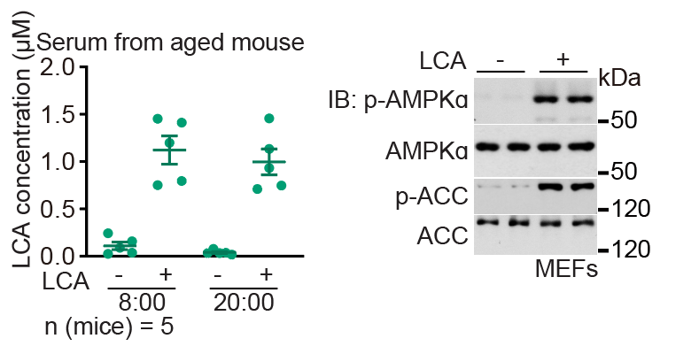 图3. 卡路里限制小鼠血清中石胆酸含量(左)以及该浓度下石胆酸对AMPK的激活(右)