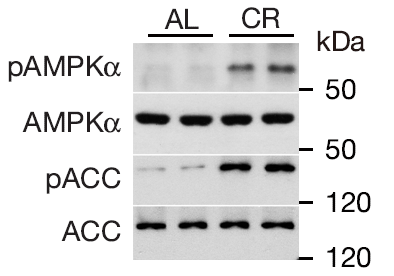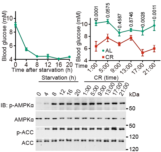图1. 卡路里限制与饥饿对小鼠血糖和肌肉AMPK激活的效果对比