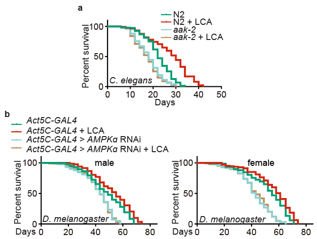 图4 石胆酸通过AMPK延长线虫(a)和果蝇(b)的寿命
