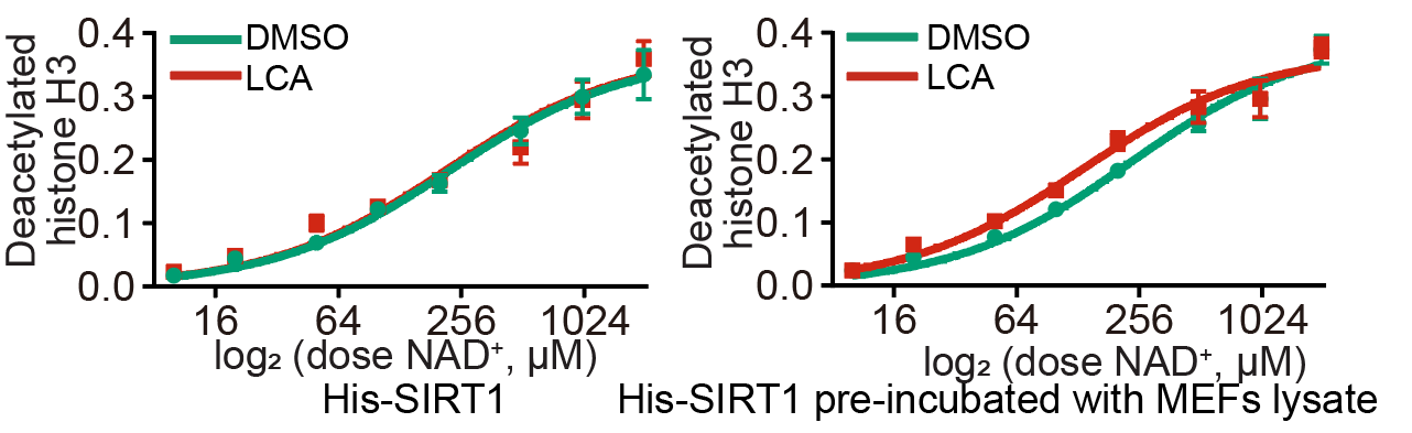 图7. 石胆酸对原核表达SIRT1蛋白(左)以及与细胞裂解液孵育后的、原核表达的SIRT1蛋白(右)的去乙酰化活力影响