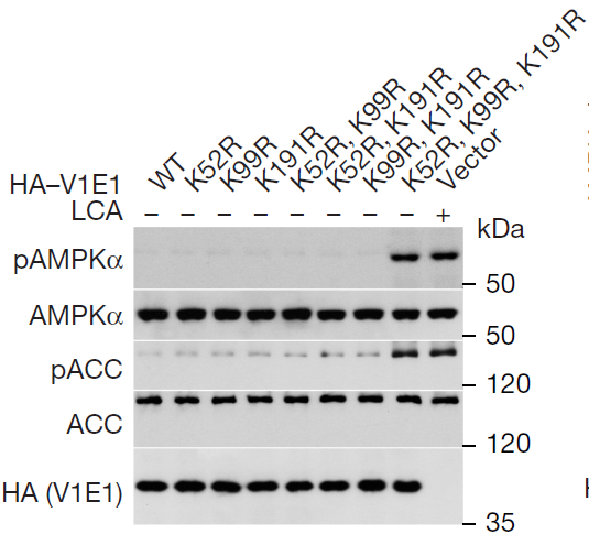 研究者们于是进一步探索石胆酸通过何种通路激活AMPK。他们观察到石胆酸,乃至卡路里限制对于AMPK的激活都不会引起AMP水平的上升,也不会引起细胞钙离子水平的增加,排除了传统的AMP或者钙离子依赖的激活途径。研究者们于是探究了先前他们鉴定出的葡萄糖感知途径即溶酶体途径,的确发现石胆酸是通过该途径激活AMPK的:敲除了溶酶体途径关键蛋白AXIN和LAMTOR1,石胆酸不再能够在细胞中激活AMPK。而鉴于石胆酸和卡路里限制都没有降低血糖到能够启动溶酶体途径的程度的能力——也就是他们先前所鉴定的感知葡萄糖的相关受体和机制都不再适用,研究者们进一步尝试寻找石胆酸靶向溶酶体途径的受体和机制。由于石胆酸能够抑制溶酶体上的质子泵v-ATPase复合体——这是溶酶体途径活化的关键节点,研究者们于是探究了石胆酸对v-ATPase的影响。他们发现,石胆酸显著影响了v-ATPase的翻译后修饰,尤其是乙酰化修饰——在添加了去乙酰化酶抑制剂,使得v-ATPase的乙酰化无法被移除(无法去乙酰化),就能够阻止石胆酸对AMPK的激活。利用蛋白质修饰质谱,他们进一步得到了构成v-ATPase复合体的全部21个(种)亚基的总共263个乙酰化修饰的位点。通过逐一将这些位点突变成R,从而模拟其去乙酰化的方式,他们最终发现,只要同时引入v-ATPase的V1E1亚基的三个位点——K52、K99和K191的突变体(V1E1-3KR),就能够在没有石胆酸处理的条件下抑制v-ATPase,并激活AMPK到和石胆酸处理相当的程度(图6),而在线虫、果蝇和小鼠肌肉中引入V1E1-3KR突变,也能起到激活AMPK和延缓衰老的效果。
