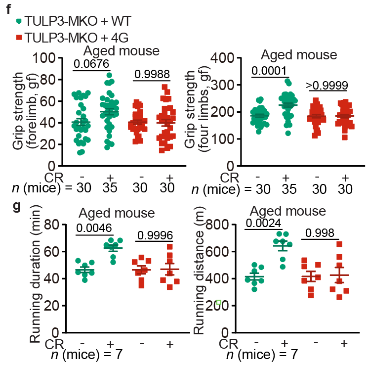 最后,研究者在线虫、果蝇和小鼠中分别探究了TULP3-sirtuin-v-ATPase轴对衰老和寿命的影响,类似于AMPK的敲除,他们发现只要将上述物种体内的TULP3敲除,或者引入无法结合石胆酸的TULP3突变体,石胆酸便无法发挥抗衰效果(图9;以小鼠肌肉中敲除TULP3再回补TULP3-4G突变体为例)。