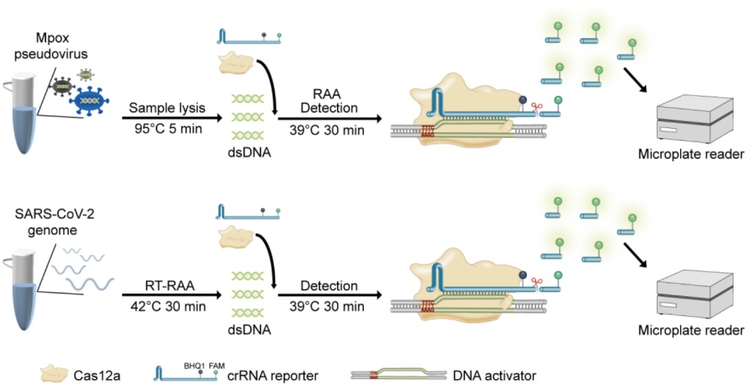 基于上述发现,团队开发了一种基于Cas12a的新型核酸检测平台—PDCD(Pre-crRNA-dependent Cleavage Detection)。这一检测方法通过将荧光基团及淬灭基团直接结合在pre-crRNA间隔区切割位点的两侧,利用Cas12a结合靶标核酸后激活的pre-crRNA反式切割活性,使得荧光基团远离淬灭基团从而释放出可检测荧光信号,实现对DNA的灵敏检测。利用该平台,团队成功实现了对猴痘病毒和SARS-CoV-2病毒的高特异性、高灵敏度的简单快速检测,展示了该技术在分子诊断领域的应用潜力。