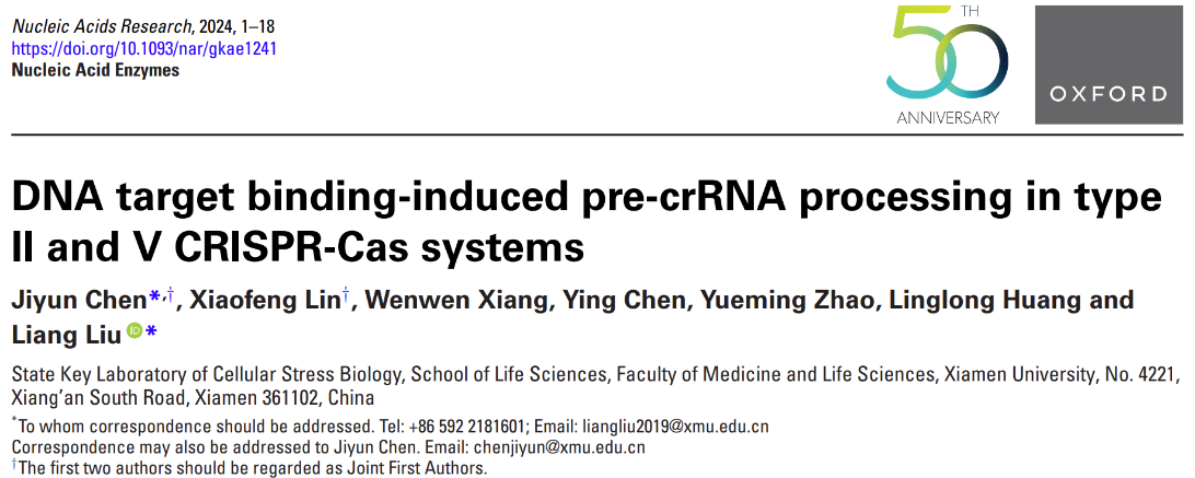 2024年12月16日,生命科学学院刘亮教授团队在《Nucleic Acids Research》期刊上在线发表了题为“DNA target binding-induced pre-crRNA processing in type II and V CRISPR-Cas systems”的研究论文,首次揭示了靶标核酸的结合能够激活CRISPR-Cas系统效应蛋白对pre-crRNA的反式切割活性,并基于该特性开发了一种新型核酸检测方法。尤为重要的是,该研究首次证实了CRISPR-Cas12a系统在体内结合靶标DNA后能够反式切割pre-crRNA间隔区,这对基于Cas12a的基因编辑工具的开发具有深远影响。