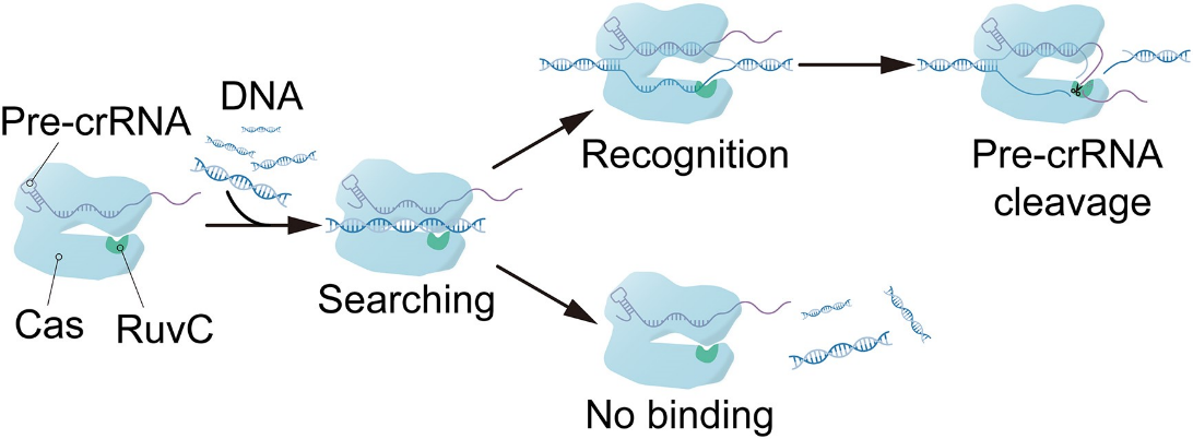 CRISPR-Cas系统是源自细菌和古细菌的适应性免疫系统,用以抵御病毒和其他外来遗传物质的入侵。该系统的运作分为三个主要阶段:间隔区序列的获取、CRISPR RNA(crRNA)的加工成熟以及对外源核酸的干扰。其中,crRNA的成熟是CRISPR效应复合体发挥功能的必要条件,涉及到对前体crRNA(pre-crRNA)的重复区(Repeat)和间隔区(Spacer)序列的加工。此前的研究表明,在II型CRISPR-Cas系统中,crRNA的repeat区序列与另一小RNA分子tracrRNA配对后,由RNase III酶进行切割;而在V型系统中,CRISPR-Cas效应蛋白能够直接加工pre-crRNA的repeat区。然而,对于spacer区是如何被加工仍未得到阐明。