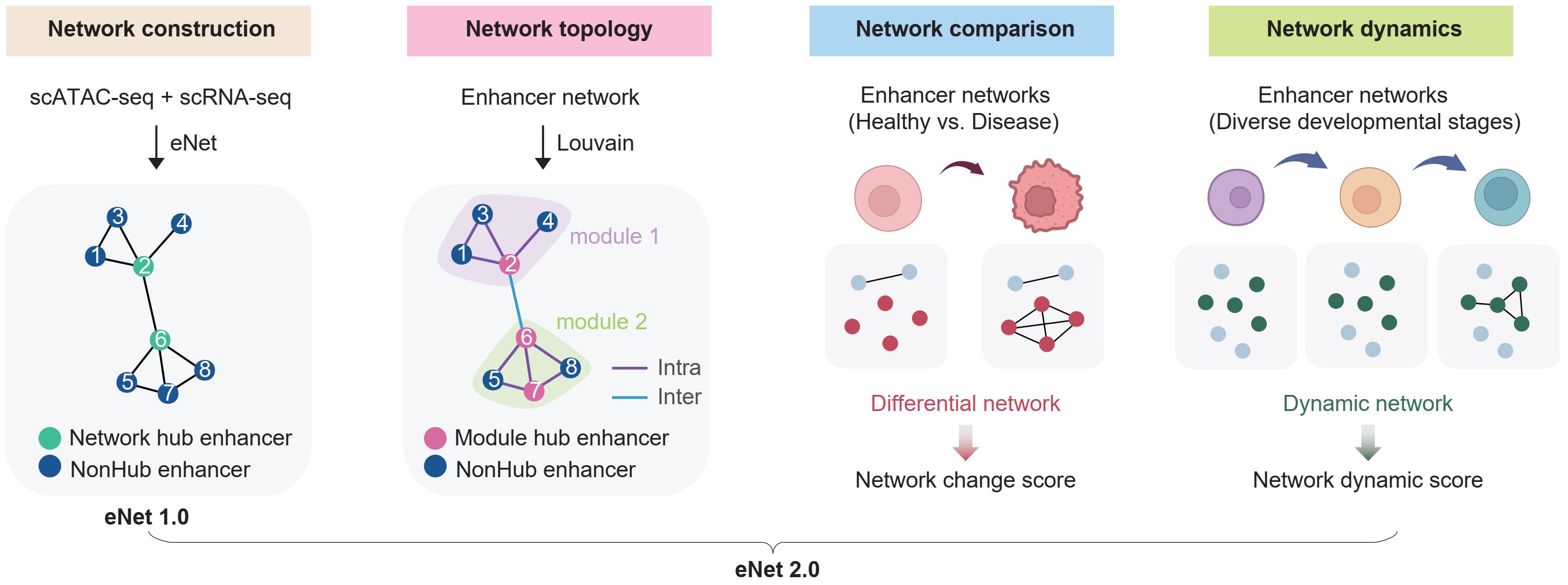 增强子是基因组中的关键调控元件,通过募集转录因子来调控基因表达。在基因组中,多个增强子可以聚集形成超级增强子或增强子簇,精确调控发育和疾病中关键基因的时空特异性表达。然而,增强子簇协同调控基因表达的具体机制尚未被充分阐明。该团队此前开发的eNet 1.0算法(Dev Cell 2022, PMID: 36495874;Brief Bioinform 2023, PMID: 36464486)首次实现了基于单细胞多组学数据构建增强子调控网络,揭示了增强子网络复杂度与基因在疾病和发育中重要性的密切关联。这一发现为识别疾病靶点和关键调控因子开辟了新途径,但增强子网络的拓扑结构及其在发育和疾病过程中的作用机制仍需深入研究。
