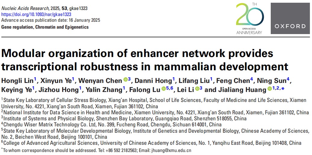 2025年1月16日,细胞应激生物学国家重点实验室、厦门大学生命科学学院/翔安医院的黄佳良教授团队在《Nucleic Acids Research》期刊在线发表题为“Modular organization of enhancer network provides transcriptional robustness in mammalian development”的研究论文。研究团队开发了eNet 2.0算法,揭示了增强子网络的模块化组织在维持基因表达稳定性中的关键作用。