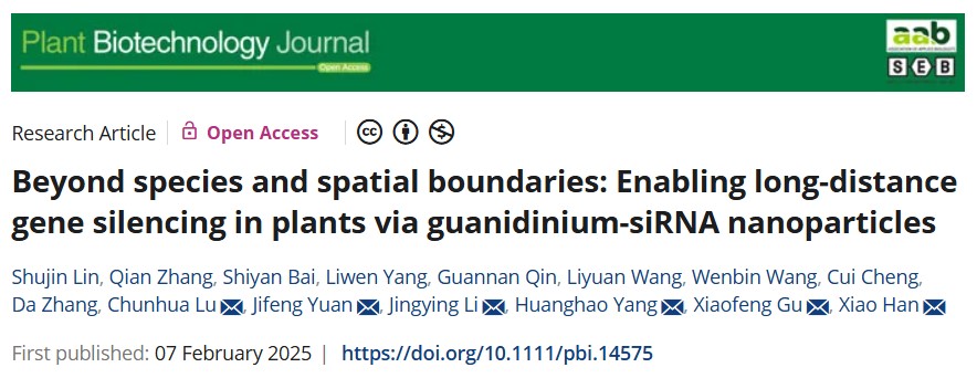 近日,袁吉锋教授团队与福州大学杨黄浩教授团队、韩霄教授和中国农业科学院生物技术研究所谷晓峰教授等合作在植物生物技术领域顶刊Plant Biotechnology Journal发表题为“Beyond species and spatial boundaries: Enabling long-distance gene silencing in plants via guanidinium-siRNA nanoparticles”的研究论文。该研究开发了一种基于胍基-siRNA纳米颗粒(Gu+-siRNA NPs)的全新递送系统,成功实现跨物种、长距离、多基因同步沉默,为农业生物技术开辟了新途径!
