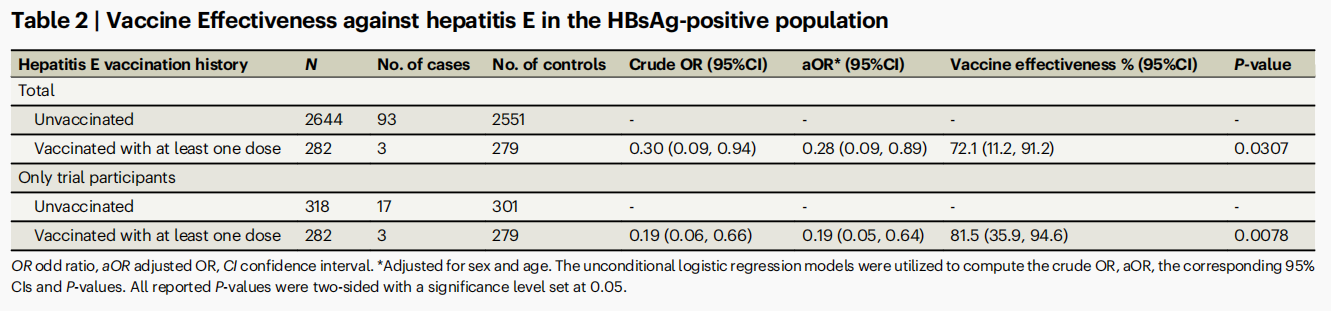 2007年8月-2017年10月期间,研究团队在江苏省东台市11个乡镇开展了益可宁®III期临床试验及并进行了持续10年的长期随访,所建立的急性肝炎监测系统覆盖11个乡镇近29万名目标年龄的居住人口。10年肝炎监测期间累计记录了313 536例疑似肝炎病例(乏力纳差≥3天),其中12 787例丙氨酸氨基转移酶(ALT)≥2.5倍正常值上限(ULN)并且有12 707例完成了初步肝炎分型检测。基于肝炎分型检测中发现的2 926例HBsAg阳性且出生于1941~1991年间(III期临床试验入选年龄)疑似肝炎病例,该研究采用检测阴性设计,主要目的为评价戊肝疫苗在HBsAg阳性人群中的保护效果。在经过年龄和性别校正后,分析结果显示接种至少一剂益可宁®的有效性为72.1%(95% CI 11.2-91.2);当分析人群仅限于III期临床试验的参与者时,有效性则达到81.5%(95% CI 35.9-94.6)。该结果表明益可宁®能为HBsAg阳性人群提供持久且有效的戊肝防护。