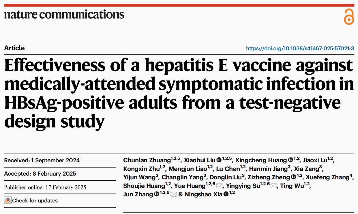 近日,该研究成果以题为“Effectiveness of a hepatitis E vaccine against medically-attended symptomatic infection in HBsAg-positive adults from a test-negative design study”的研究论文在线发表于《自然·通讯》(Nature Communications)。庄春兰、刘晓辉为该论文共同第一作者,夏宁邵院士团队的张军、苏迎盈、黄悦为该论文共同通讯作者。该研究得到了国家重点研发计划、国家自然科学基金、博士后基金、中央高校基本科研业务费专项资金、传染病疫苗研发全国重点实验室开放课题、翔安创新实验室开放课题的支持。
