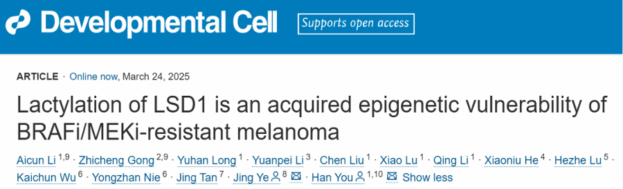 2025年3月24日,尤涵教授团队在Developmental Cell杂志在线发表题为“Lactylation of LSD1 is an acquired epigenetic vulnerability of BRAFi/MEKi-resistant melanoma”的研究论文。该研究首次揭示靶向药耐受黑色素瘤中乳酸驱动的LSD1乳酰化修饰通过抑制铁死亡维持耐药细胞生存的机制。提出LSD1抑制剂通过触发耐药细胞铁死亡,重塑肿瘤免疫微环境,增敏PD-1抑制剂的全新策略,为克服靶向药耐受提供精准靶点。