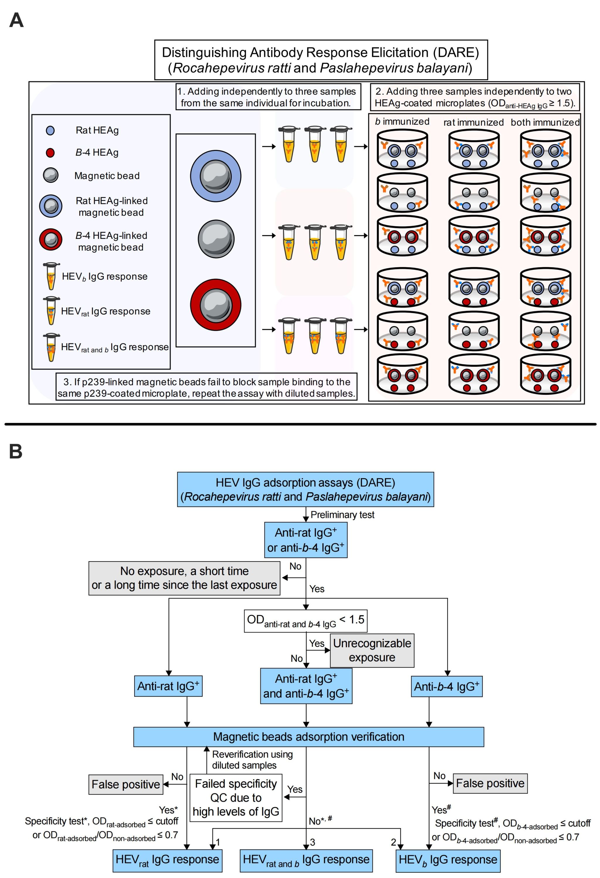 大鼠戊型肝炎病毒(rat hepatitis E virus,简称HEVrat)属于戊型肝炎病毒科的罗卡属鼠类种(Rocahepevirus ratti)基因1型,早期研究显示该病毒在大鼠种群中广泛传播。2017年,研究人员首次观察到HEVrat能够感染人类并引发肝炎(Emerg Infect Dis, 2018),表明其具有潜在的人畜共患性并因此受到广泛关注。截至2025年3月,亚洲及欧洲地区已陆续报告37例HEVrat感染病例,提示该病毒对人类的感染并非罕见个案,溢出感染仍持续发生。然而,HEVrat在人群中的既往感染情况一直缺乏适合的检测方法,导致无法对该病毒在人群中的溢出风险及致病性进行有效的评估。造成这一现状的最主要原因之一在于,相较于人群中主要传播的戊型肝炎病毒帕斯拉属巴拉扬尼种(Paslahepevirus balayani,简称HEVb),HEVrat的衣壳蛋白同源性约为55%。两种抗原与既往暴露人群血清的反应性存在明显异质性,同时又存在一定的交叉反应性(J Hepatol,2021;JHEP Rep,2023),这使得通过简单的抗原反应性,难以准确区分HEVrat与HEVb的既往暴露人群。