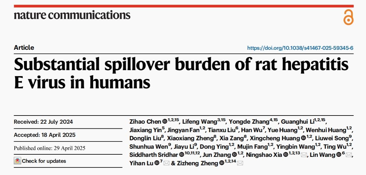 2025年4月29日,夏宁邵、郑子峥教授团队在Nature Communications上发表题为Substantial spillover burden of rat hepatitis E virus in humans的研究论文。