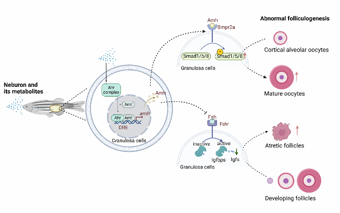 综上所述,类似草不隆这种普遍认为降解快、低残留、毒性低的新型Ahr激动剂类农药,进入体内转化为仍具有毒性的代谢产物,通过结合Ahr促进其核转位结合到amh启动子转录调控Amh水平上升,从而过度激活Amh/Bmpr2a通路,最终诱发了卵泡发育异常。该研究为干预化学污染物暴露相关的卵泡成熟障碍提供了新思路,也为Ahr激动剂活性类污染物的健康风险评估提供了科学依据。