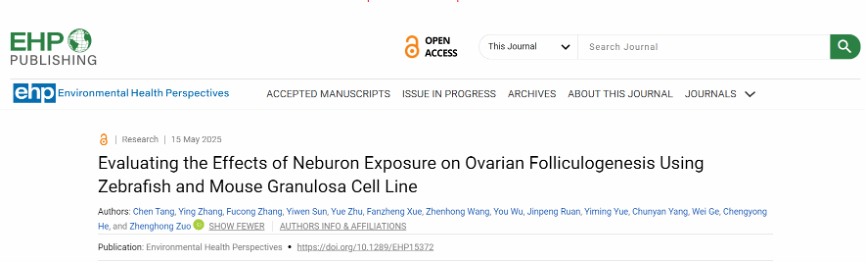 2025年5月15日,左正宏、何承勇教授团队在Environmental Health Perspectives上发表题为Evaluating the Effects of Neburon Exposure on Ovarian Folliculogenesis Using Zebrafish and Mouse Granulosa Cell Line的研究论文,该研究首次发现了芳香烃受体(Ahr)激动活性类农药草不隆(Neburon)对雌性生殖系统的影响,揭示了抗缪勒管激素(Amh)在农药诱导卵泡发育异常中的重要作用,为Ahr激动活性类污染物引发的卵巢发育损伤的作用机制提供了新见解。