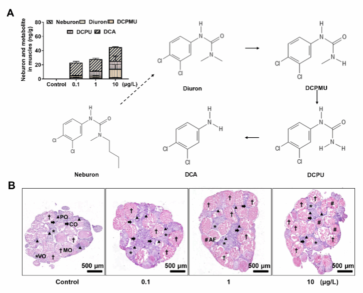 研究结果显示,在暴露后的斑马鱼体内中并没有检测到草不隆的残留;该团队推测草不隆发生降解,继而发现它的4种代谢产物有体内均有残留并表现出剂量效应;进一步利用转基因鱼验证发现这些代谢物均具有Ahr激动活性,提示该农药的长期环境健康风险。而且,草不隆暴露后,斑马鱼呈现出不同时期卵泡比例的改变及卵母细胞质量下降, 并伴随Amh水平上调,表明草不隆造成了斑马鱼卵泡发育异常。